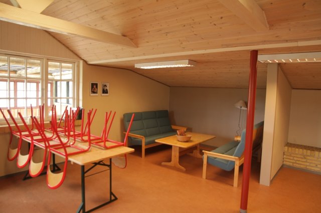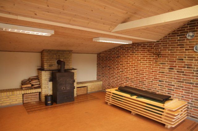 Fine toiletter, rimeligt udstyret køkken, 12 indendørs sovepladser og stort fællesrum med plads til ca. 40 personer