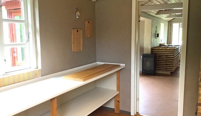 Gangen i tilbygningen med de to toiletter til ventre herfor, det fjerneste med bad. Interim-køkkenet er ligefrem gennem døren