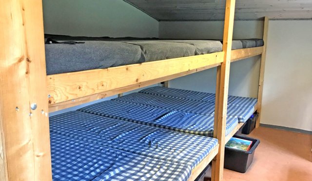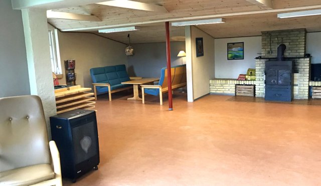 Fine toiletter, rimeligt udstyret køkken, 12 indendørs sovepladser og stort fællesrum med plads til ca. 40 personer